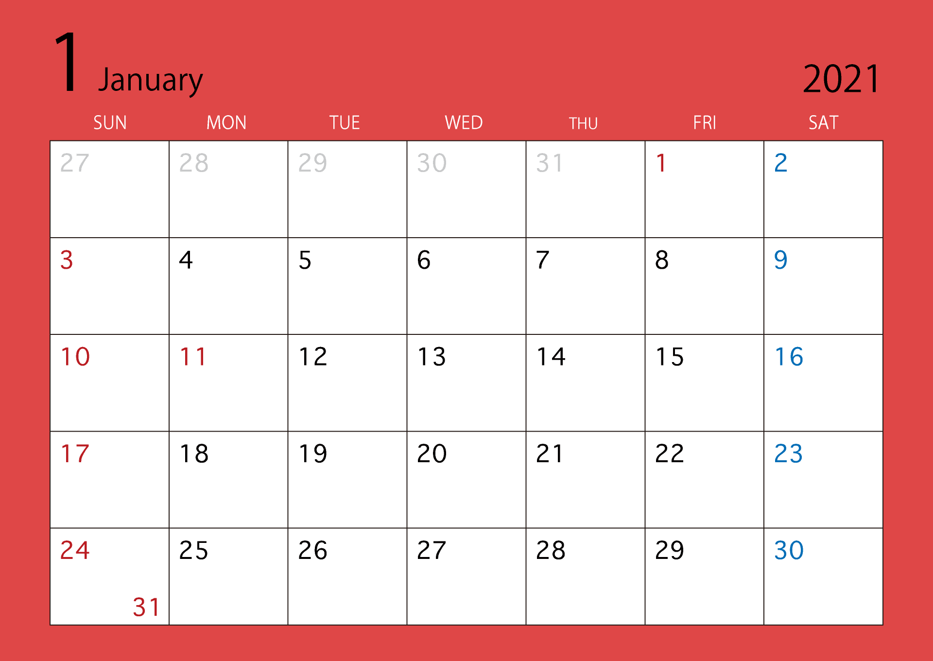January 2021 calendar (color)