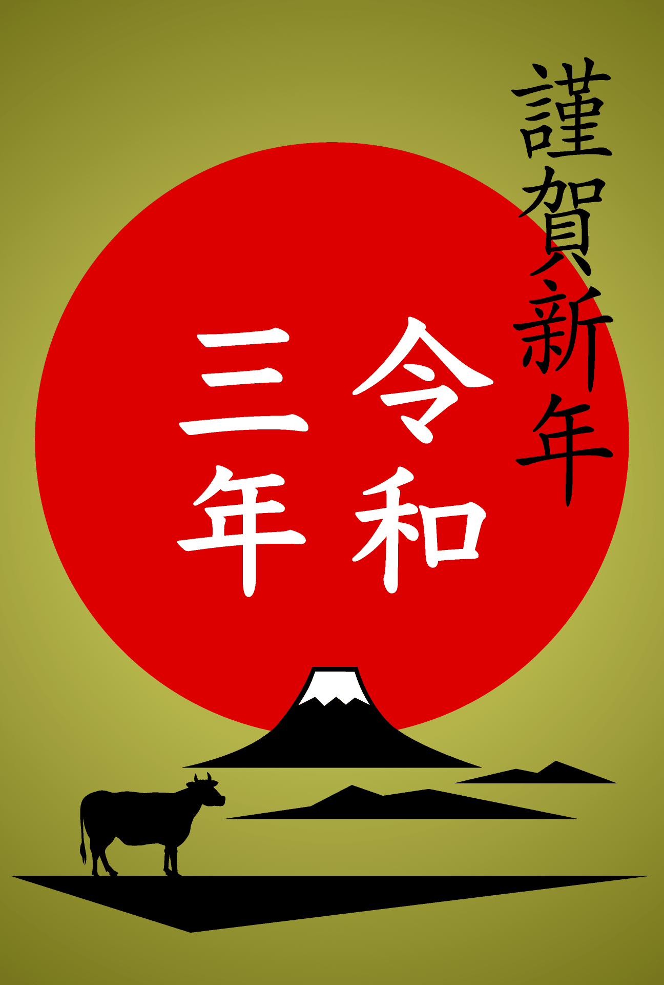 Monochrome line art cow (front-facing face), greetings and Mt. Fuji-2021-Cute Ox Year -