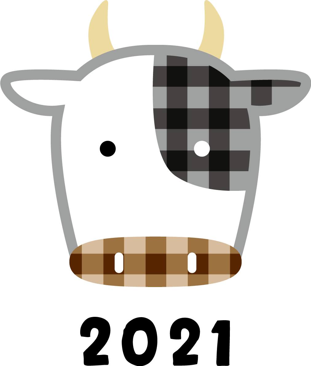 Monochrome line art cow (front-facing face), greetings and Mt. Fuji-2021-Cute Ox Year -