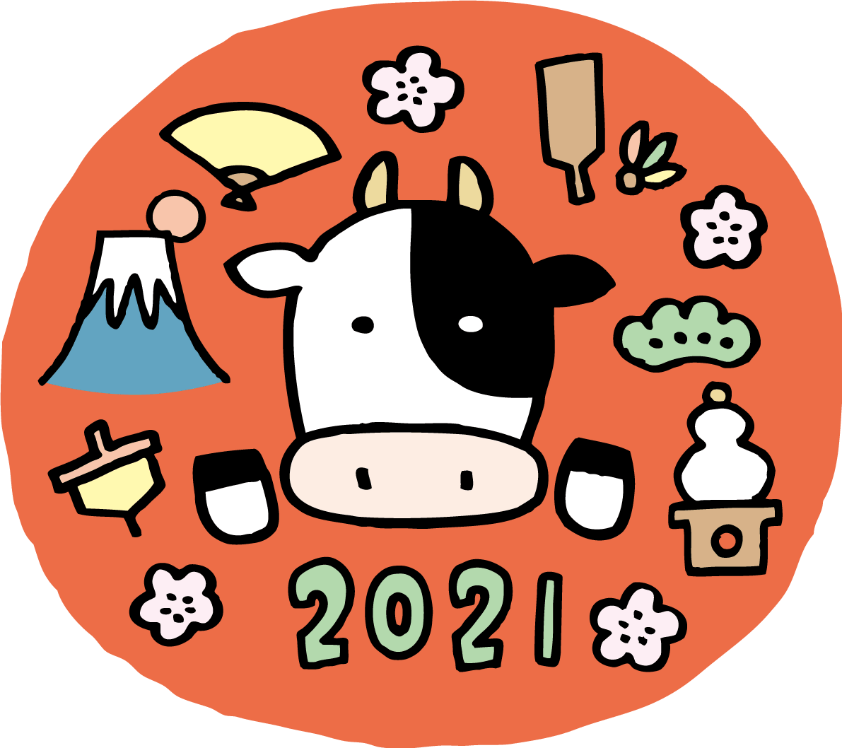 Monochrome line art cow (front-facing face), greetings and Mt. Fuji-2021-Cute Ox Year
