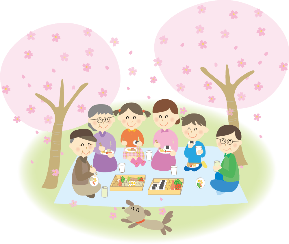 A family of 6 having a cherry blossom viewing party
