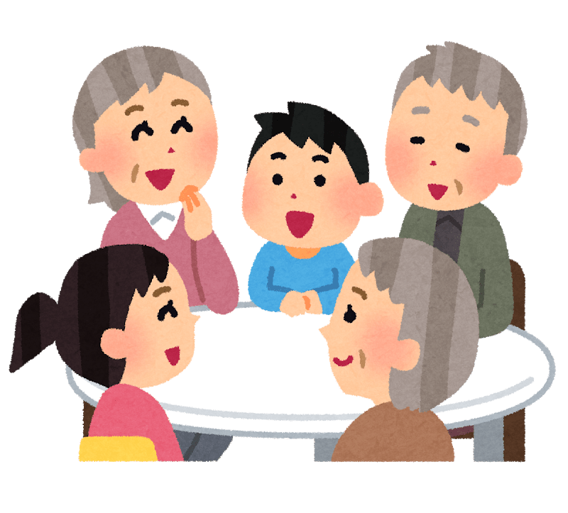 3 generation family (old man and woman-dad-mother-son-daughter) guts pose -